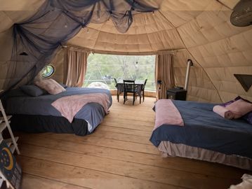 Our Nordic Nook Geodome, inspired by Viking spirit our décor, inclaudes a faux sheepskin rugs and rustic features. You'll feel like you've journeyed to a time of explorers. Enjoy the comfort of a king-sized bed while immersed in the rugged charm.